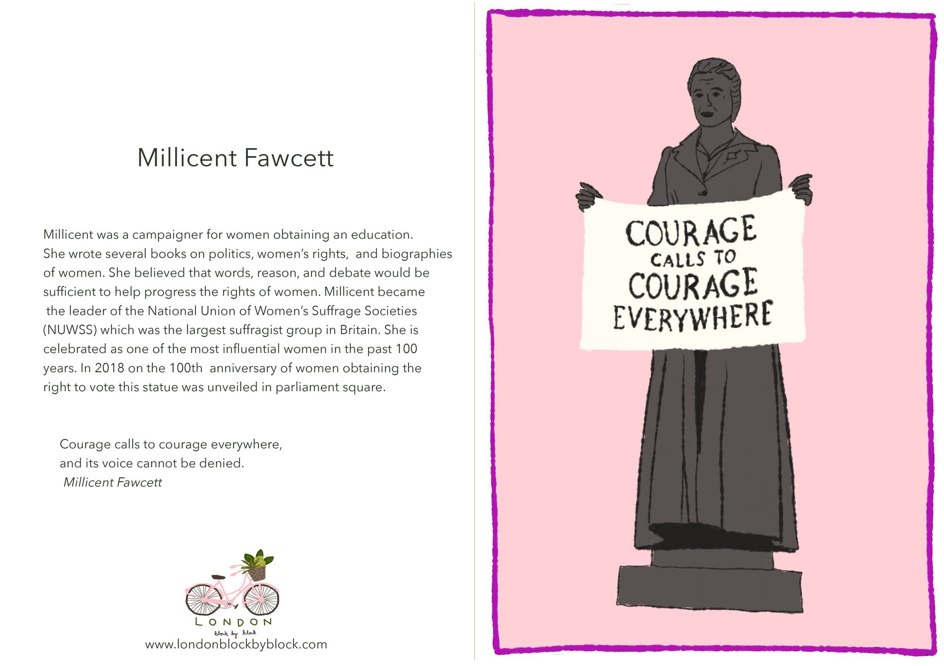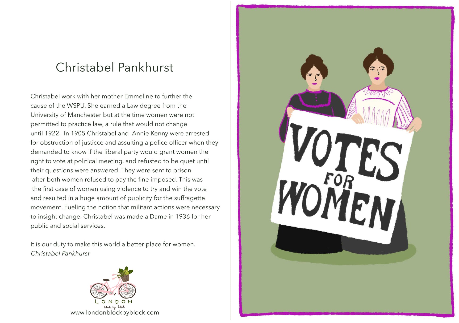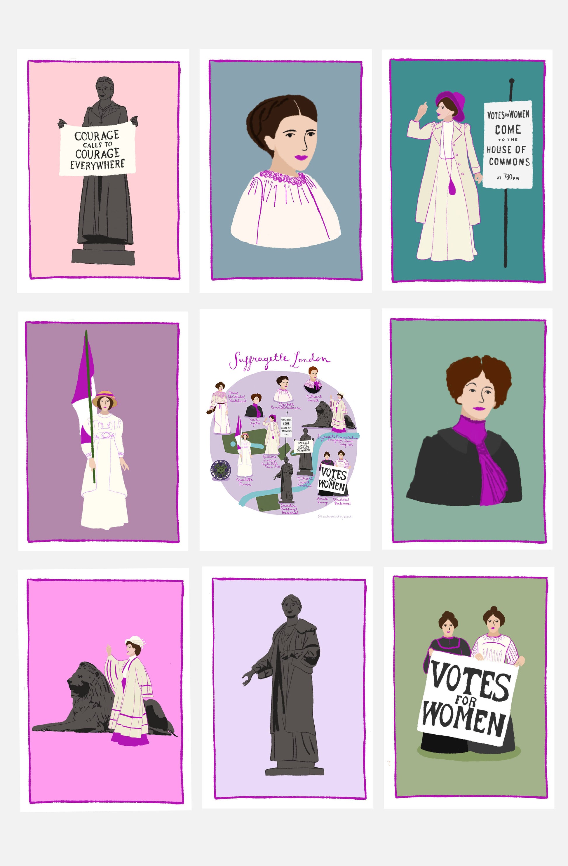 The Suffragette London Illustrated Greeting Card Set highlights nine  women and events that were critical to furthering women's rights in the United Kingdom. The back of each card contains a short history about the suffragette or event illustrated. This set includes:Emmeline & Christabel Pankhurst's home - 50 Clarendon Walk - SuffragettesHertha Ayrton's home - 41 Norfolk Square- Inventor, Physicist, Mathematician, SuffragetteElizabeth Garrett Anderson's home - 20 Upper Berkeley Street - Physician, Mayor, SuffragetteMillicent Fawcett's home - 2 Gower Street- Writer, Activist, SuffragetteSuffragette Demonstration led by Sylvia Pankhurst - Trafalgar Square- 27th July 1913Millicent Fawcett statue - Parliament SquareWomen’s Sunday - Hyde Park- March 21 June 1908Emmeline & Christabel Pankhurst Memorial- Victoria Tower GardensThese are perfect for sending to your family and friends, giving as a gift,  or keeping for yourself.